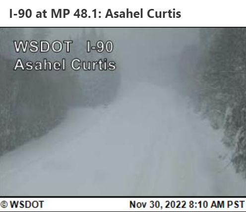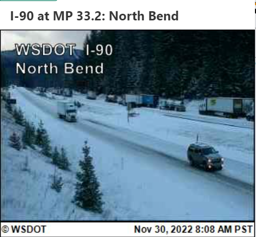 At approximately 630 am, I-90 closed eastbound at North Bend (MP 34) due to multiple spinouts and collisions. Chains are required westbound. There is snow and ice on the roadway.