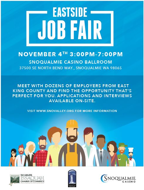 The Greater Issaquah and SnoValley Chamber of Commerce are hosting the largest job fair in East King County this Thursday, November 4th from 3 to 7 PM at the Snoqualmie Casino Ballroom.