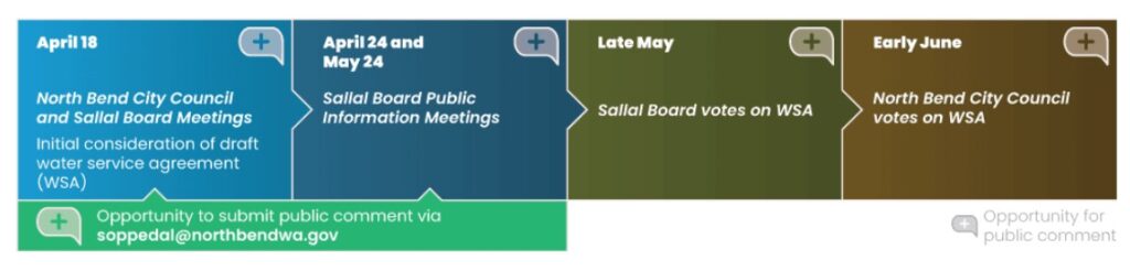 On April 18th, 2023, the North Bend City Council voted unanimously to approve the first read of a resolution to sign a water supply agreement with Sallal Water Association. Mayor McFarland, who has been deeply involved in this issue, spoke passionately to support the deal. You can listen here; the discussion starts at 1:26:28. The contract can be viewed here.