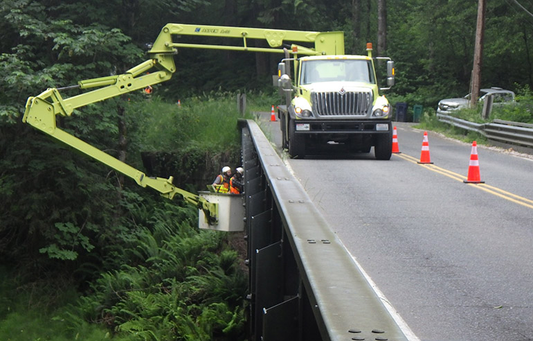 [Featured Image: Two engineers inspect the Ames Lake Trestle Bridge from the bucket of an under-bridge-inspection-truck (UBIT) truck.]