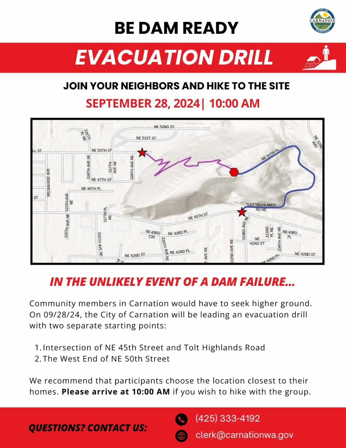On 09/28/24, the City of Carnation will be leading an evacuation drill with two separate starting points: