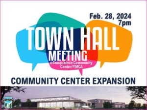 Residents are invited to a Community Center Expansion Town Hall on February 28, 2024, 7pm, at the Snoqualmie Community Center/YMCA gymnasium. The Town Hall is an opportunity to learn more and ask questions about the City’s Community Center Expansion Project that will expand the existing city-owned building and add an aquatics center to meet the needs of local youth, teens, adults, and seniors.