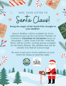 Santa’s Mailbox will be available for letter submissions during the Carnation Chamber of Commerce Christmas in Carnation event on December 7, 2024, from 2:30 PM – 6:00 PM.