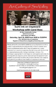 Mt Si Artist Guild is honored to have Carol Ross teach Sumi Ink on Clayboard on April 15, 2023, from 9-12:30 PM at Si View Community Center.