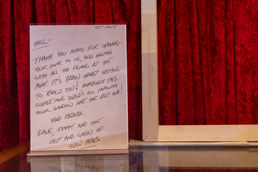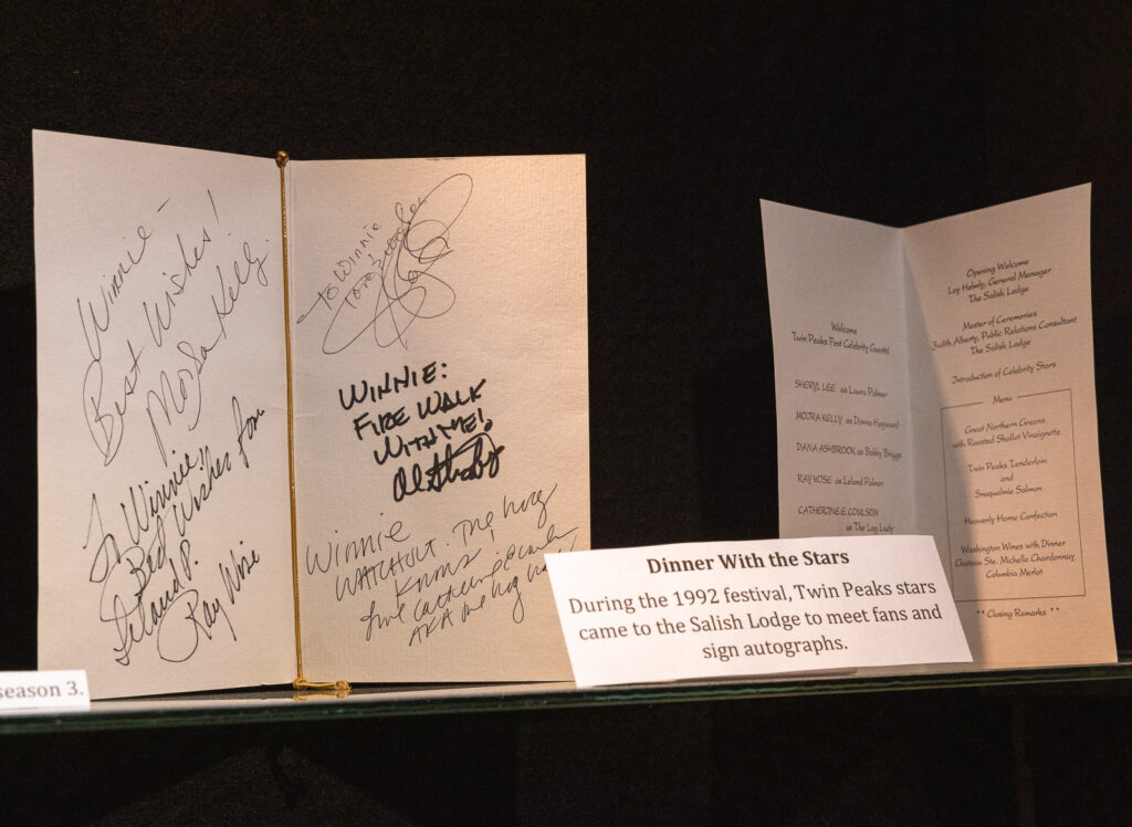 The Snoqualmie Valley Historical Museum collaborated with Twin Peaks fans and collectors to create the museum exhibit The Real Twin Peaks. This exhibit focuses on the series’ creation and the impact it has had on fans. The showcased filming props and production documents give a behind-the-scenes look at the show’s creation. Visitors eager to learn more about the locations where their favorite scenes were filmed can learn about the history of prominent filming locations through educational exhibit slides.