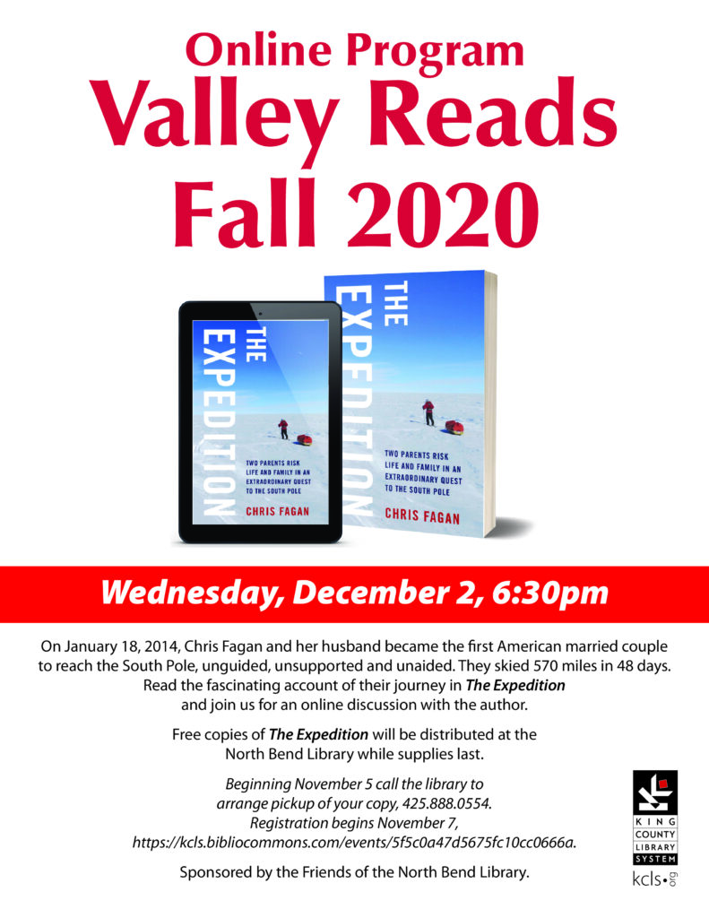 The book selected for the first online presentation is The Expedition, written by a North Bend Local. On January 18, 2014, Chris Fagan and her husband became the first American married couple to reach the South Pole, unguided, unsupported, and unaided. They skied 570 miles in 48 days.