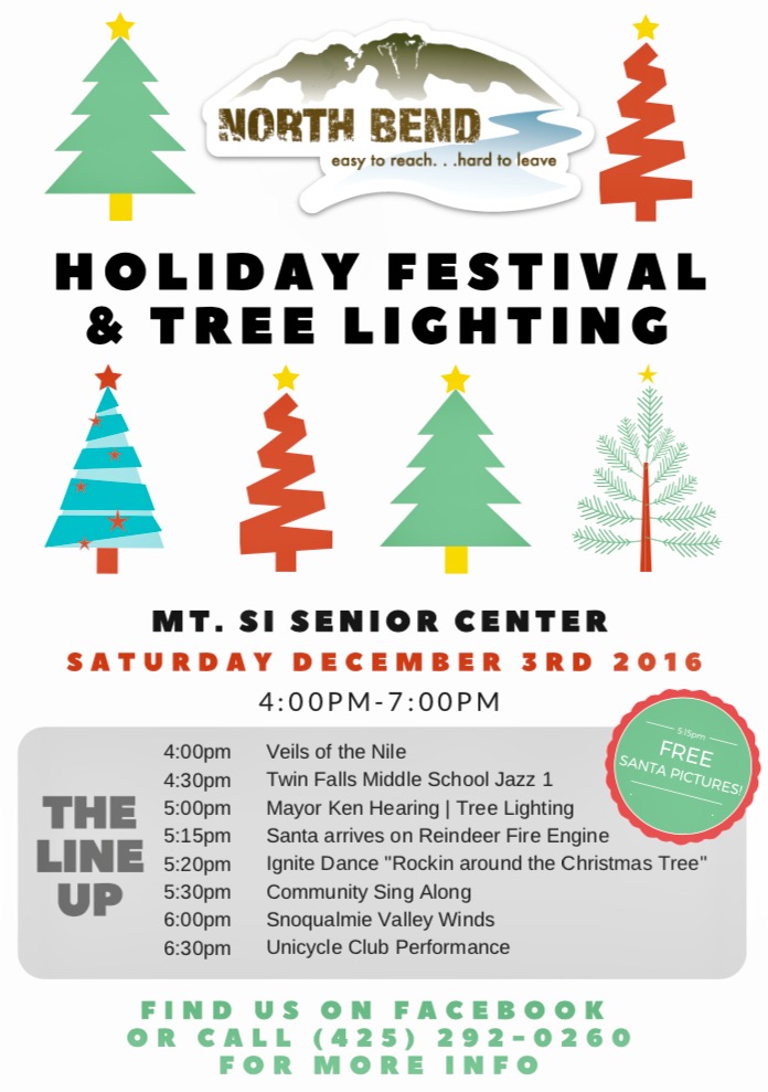 Then the City of North Bend officially kicks off the Holiday Season at the North Bend Holiday Festival on Saturday, December 3rd from 4PM to 7PM at Mt Si Senior Center, 411 Main Avenue South.