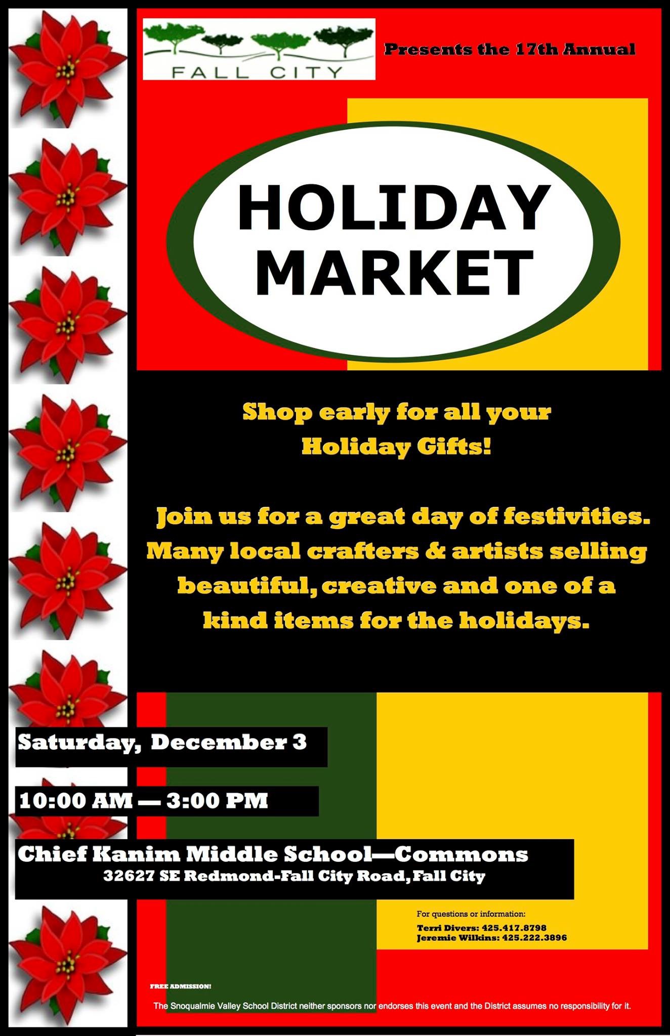 The 17th annual Fall City Holiday Market runs from 10AM to 3PM at Chief Kanim Middle School, with LOTS of local artisans offering products.