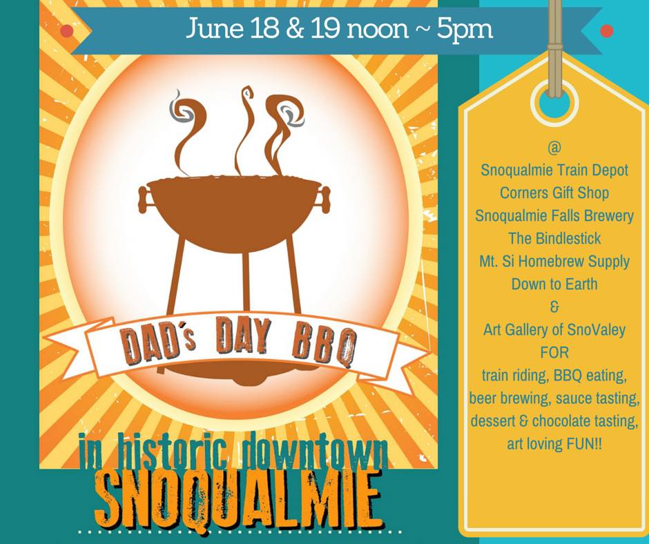 Participating shops and cafes are located across the street from the Snoqualmie Depot and include Corners Gift Shop, Snoqualmie Brewery & Taproom, The Bindlestick, Down to Earth and Sno Valley Art Gallery. The celebration includes Stonewall Kitchen BBQ Sauce Tasting, BBQ Menu Specials, Beer Brewing Lessons, a Dessert & Chocolate Tasting during Father-Daughter Art Exhibit, and an Arts Party at the ART GALLERY OF SNO VALLEY where kids can create an artsy painted tie for Dad.