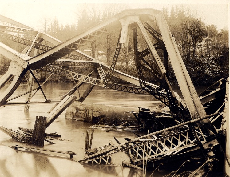 There was a plan to raise the damaged bridge from the river and reconnect it, but more flood waters brought a log jam downstream. The jam caught the collapsed bridge’s steel girders and pushed the severed end downstream. The bridge then had to be blasted away to protect the towns of North Bend and Snoqualmie.