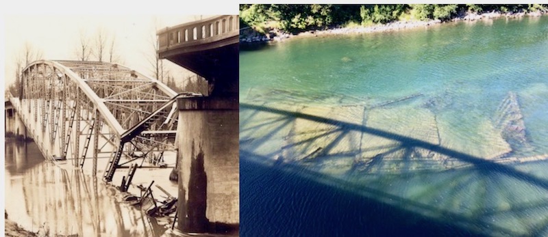 It turns out in December of 1933, during a flood event, an oil tanker truck had ended up in the swirling Snoqualmie River and hit the bridge’s wooden abutment, causing the tanker to burst into flames. The abutment caught fire. According to the Snoqualmie Valley Historical Society, the heat of the oil-fed fire burned through the bridge’s steel beams, causing the north end to drop into the river.