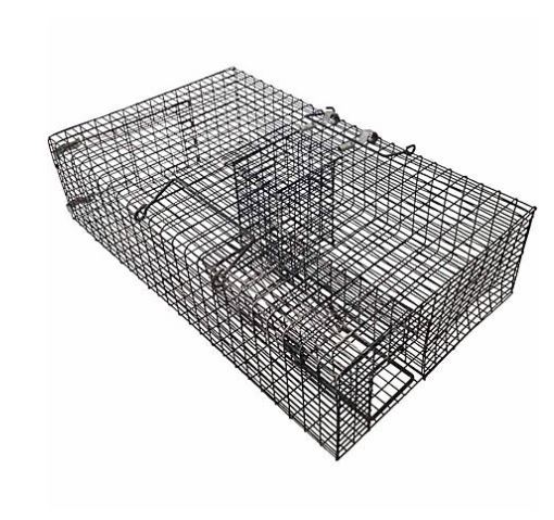 The trap is a large cage with a seesaw door. The rat pushes down the door to access the bait, the door closes behind, and bingo bango you’ve caught a rat!