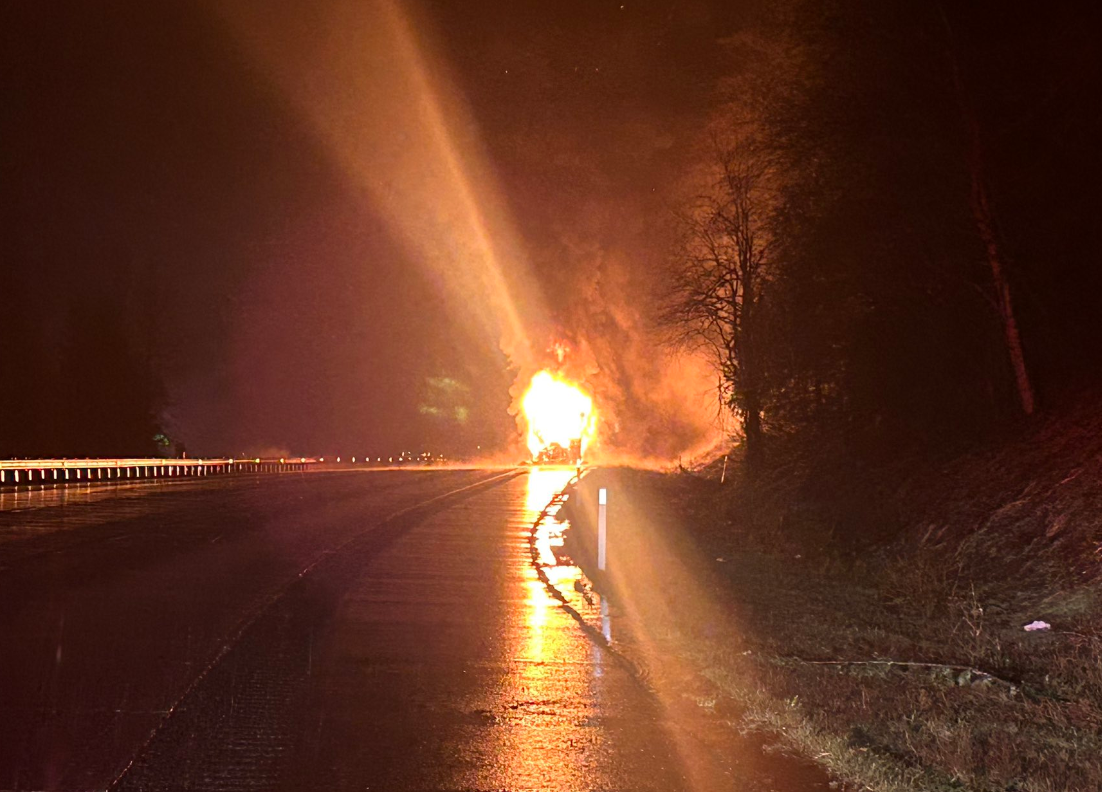 Crews were dispatched to westbound I-90 east of North Bend for an RV on fire. The fire caused ammunition in the RV to explode. All occupants exited the RV. The roadway was closed as a precaution. The fire was extinguished, and the King County Fire Investigator was called to the scene.