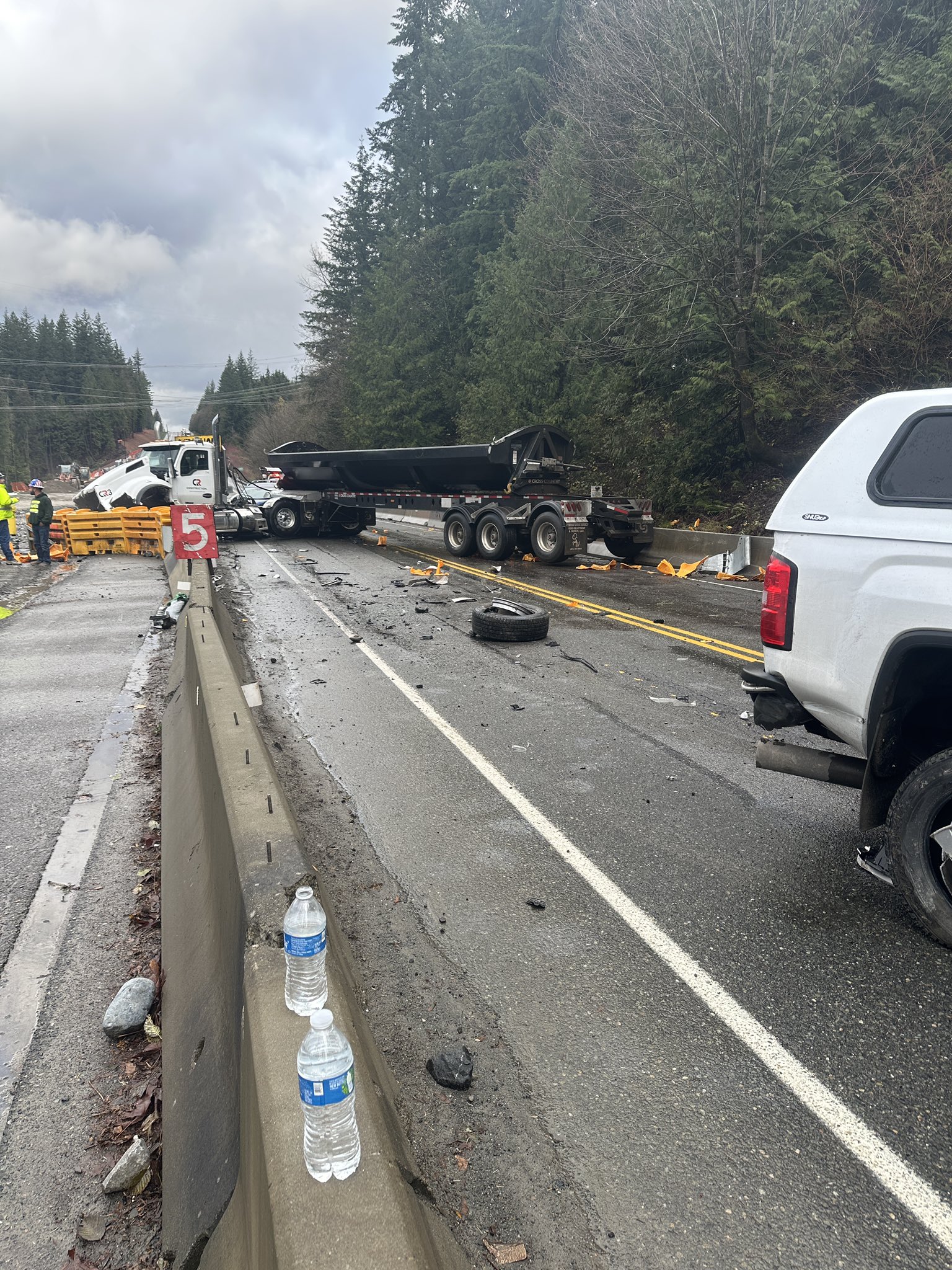 Crews were dispatched to SR 18 near the Raging River for a collision involving a dump truck, pickup truck, and SUV blocking all lanes. One person suffered non-life-threatening injuries and was transported to the hospital.