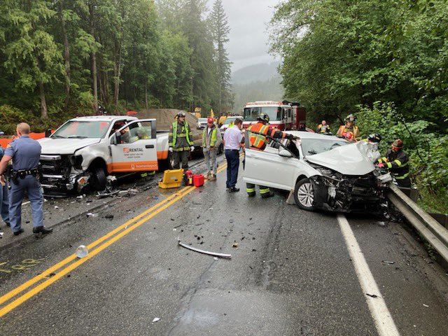 The motorcyclists were sent down a ravine. One person was airlifted to Harborview Medical Center, and the other was transported by ambulance. Both suffered life-threatening injuries.
