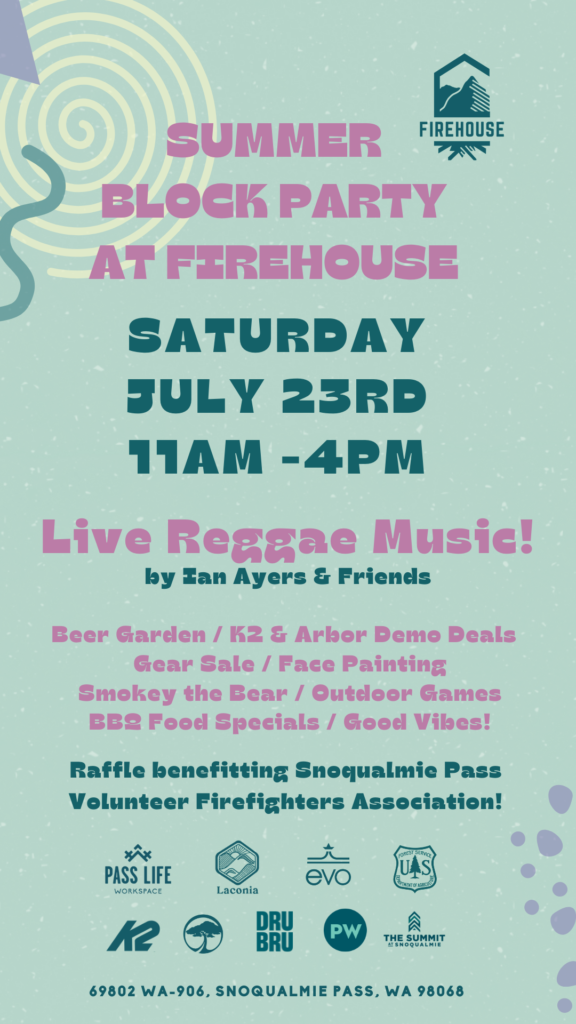 Celebrate summer on the pass July 23rd from 11 to 4 with a block party benefiting the Snoqualmie Pass Volunteer Firefighters Association!