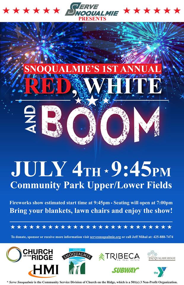 Serve Snoqualmie and the City of Snoqualmie are hosting the 1st Annual Red White and Boom Fireworks Celebration. The event will be at Snoqualmie Community Park, 35016 SE Ridge St, on July 4th. Seating will be available in the upper and lower fields beginning at 7PM, with the professional pyrotechnics fireworks display starting around 9:45PM.