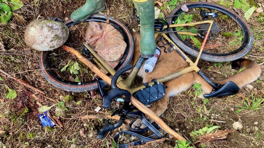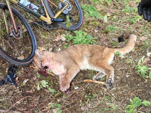 Wolf’s bike was used to hold the cougar down. The 17lb carbon fiber Specialized bike was purchased just months prior for $6k. Unfortunately, the bike was destroyed. Specialized replaced the bike at no charge, and Northwest Bicycle in Maple Valley assembled it at no charge. The bike has now been named BB for Badass Bitches.