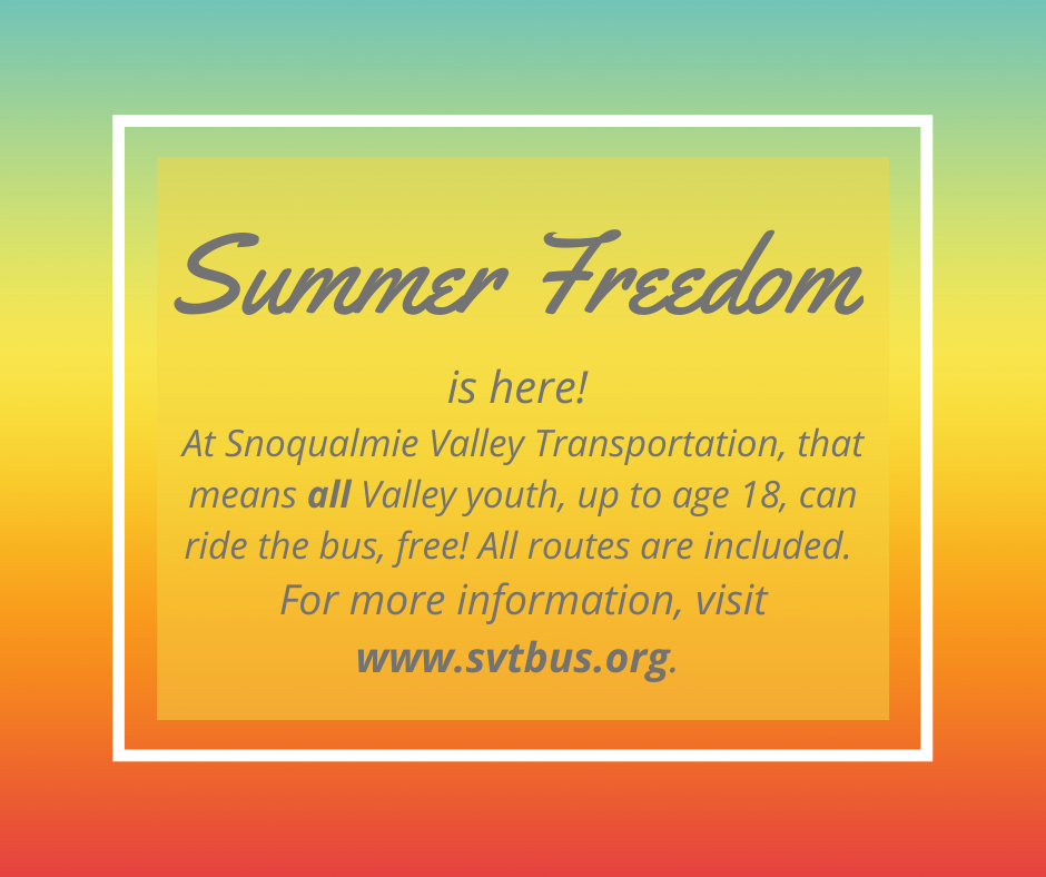 “Summer Freedom will help families with their transportation needs and get the next generation familiar with using public transportation and with SVT,” says Snoqualmie Valley Transportation Director Amy Biggs. “We want to get people where they need to go, and we think this is a great way to do it while helping a lot of parents.”
