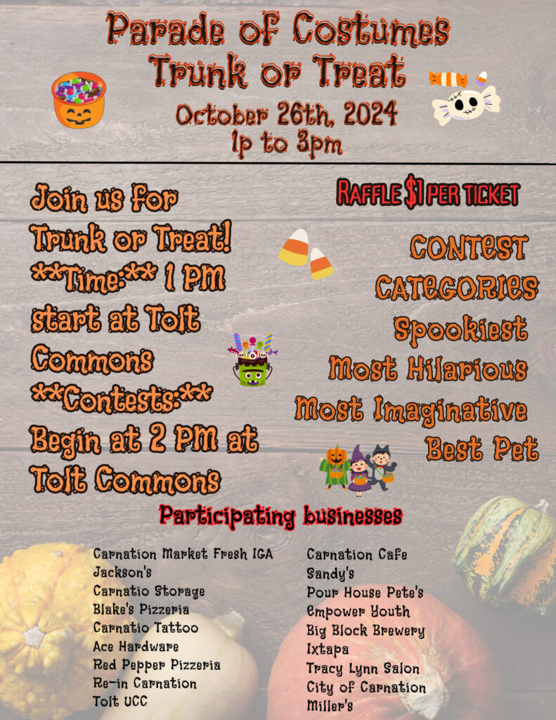 Join the Carnation Chamber for its Parade of Costumes and Trunk or Treat event. The parade will start at Carnation Market and end at Tolt Commons, where a costume contest and raffle will be held.