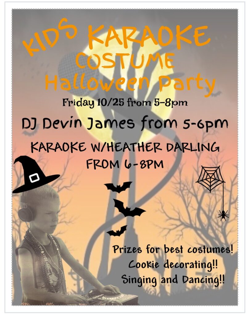 Pour House Pete’s is hosting a kids karaoke costume party! DJ Devin James will kick off the fun with music and cookie decorating from 5:00-6:00 pm, followed by karaoke from 6:00-8:00 pm. There will be costume contests, singing, dancing, and prizes. Don’t miss out on this spooktacular event!