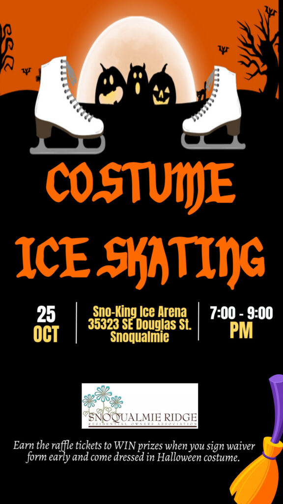 The Ridge Owners Association (ROA) is hosting a FREE Spooktacular Family Ice Skating event exclusively for Snoqualmie Ridge residents. Enjoy free entry to the ice rink, skate rentals, light refreshments, and raffle prizes! Earn additional raffle tickets by wearing a costume and signing the electronic waiver in advance.