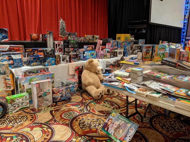 Volunteers gather the donated gifts. The Casino once again generously donated their ballroom for the setup and distribution of the gifts. Parents signed up for a shopping appointment with school counselors, at food banks, and via email.