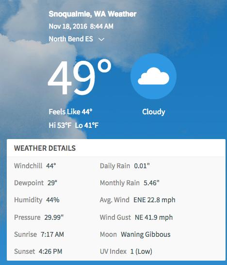So far Friday, North Bend Elementary had picked up a 42MPH wind gust. Before power went out this morning at Mount Si High School its weather station had picked up gusts in the mid 30’s. Sustained winds are around 20MPH.