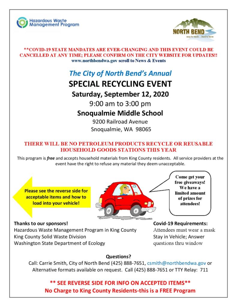 I don’t know about you but I did quite a bit of spring covid cleaning. If you did too and find yourself with household materials that you’re looking to recycle or get rid of, the City of North Bend is a hosting special recycling event on Saturday, September 12, 2020 from 9 a.m. to 3 p.m. at Snoqualmie Middle School, 9200 Railroad Avenue in Snoqualmie.