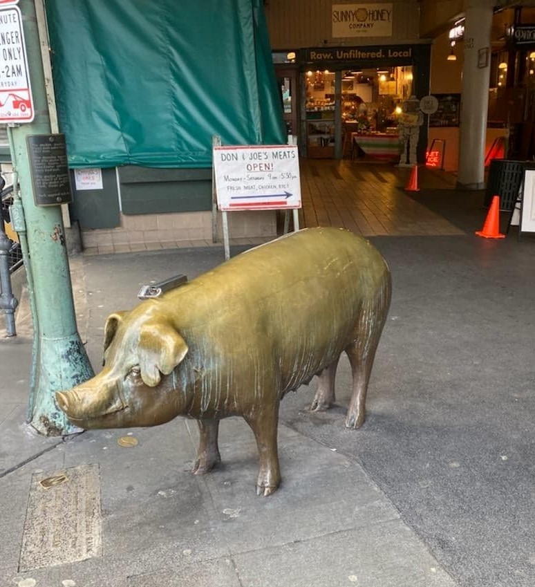 We proceeded to get a little lost, but eventually found our way to Pike Place Market. In February our niece came to visit with her family and they did all the local sightseeing things, including the market. What a stark contrast between then and now. Usually navigating the front of the market is difficult, but we passed by with ease noting the lonely pig and empty parking spots.
