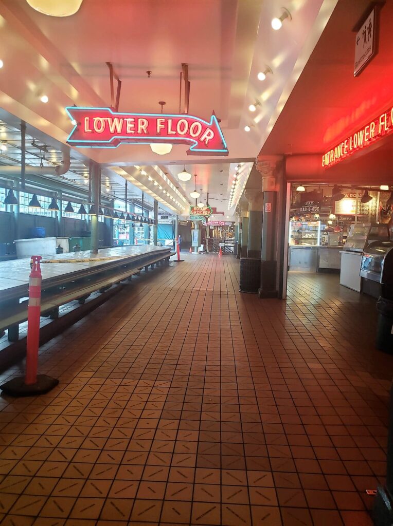 We drove back through Pioneer Square, hopped back on the freeway by Century Link and came home only seeing a handful of people out doing their essential business in Seattle. Out of curiosity I asked a friend who had recently shopped at the market (the market is open for grocery shopping but should be patronized by locals, just like here) for photos of the market now and they are sobering.
