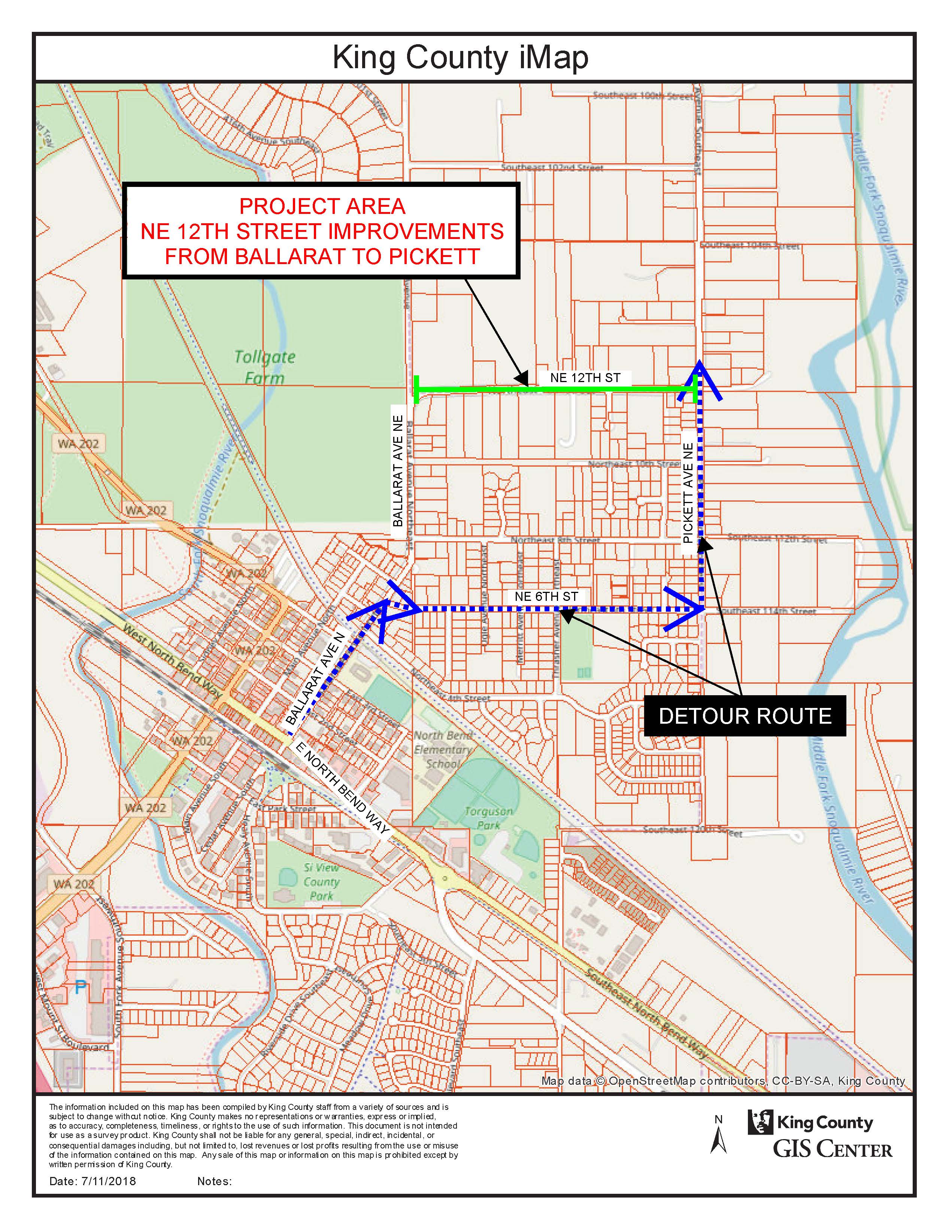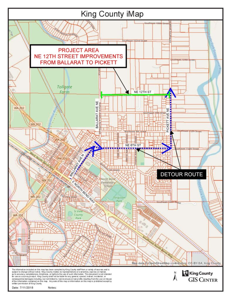 Note: This right-of-way borders unincorporated King County and the City of North Bend; property owners abutting the northern edge of 12th Street live in unincorporated King County and property owners abutting the southern edge of 12th Street live in North Bend. This road was originally constructed by King County prior to various storm water regulations that are now in place. The new road will meet current road standards with thicker pavement, sufficient gravel base and new corrugated metal pipe culverts.