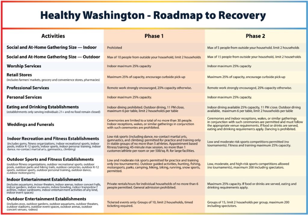 Today, the Washington State Department of Health (DOH) announced that based on Governor Jay Inslee’s Healthy Washington – Roadmap to Recovery plan released earlier this week, that all eight (8) regions in Washington will remain in Phase 1 until at least Monday, January 18, 2021.