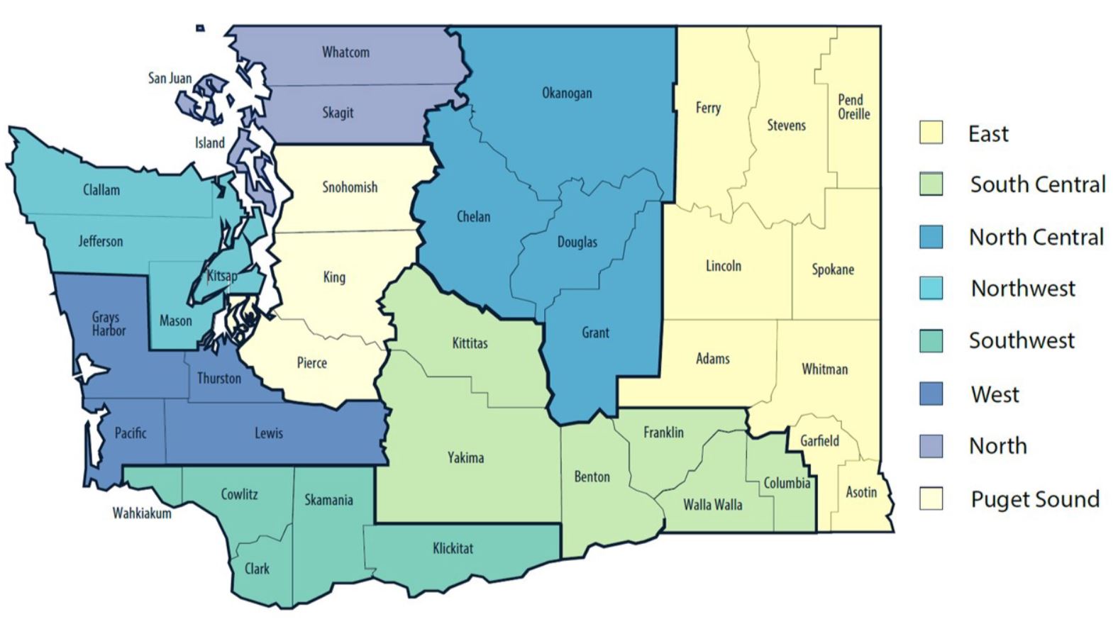 - North: Island, San Juan, Skagit, Whatcom
