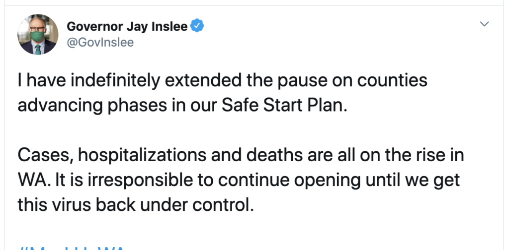 The governor stated, “Cases, hospitalizations and deaths are all on the rise in WA. It is irresponsible to continue opening until we get this virus back under control.”