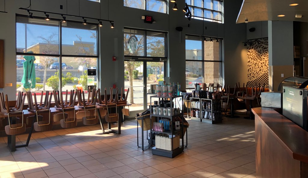 Starbucks halted in-store seating Sunday afternoon, before the proclamation was announced. In Snoqualmie, stores were empty with chairs on tables, outdoor tables removed, and condiment stations emptied. Customers can mobile order or use the drive-thru only.