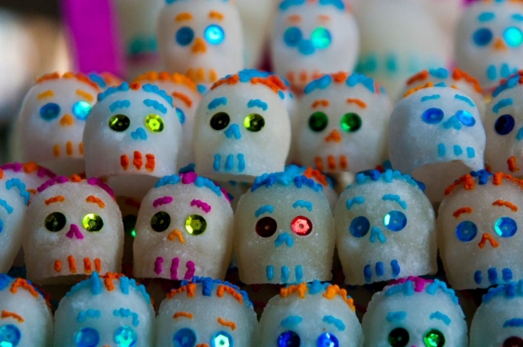 When the Spanish conquered Mexico five hundred years ago, they changed the ritual to November 1st and 2nd to coincide with the Catholic celebration of All Souls Day. The current festivities are now a hybrid of both traditions and range from week-long festivities at the cemetery to simply lighting a votive in memory of the dead. A closer look at an altar reveals religious items such as crosses, images, statues of saints, and votive candles, the skulls made of sugar instead.