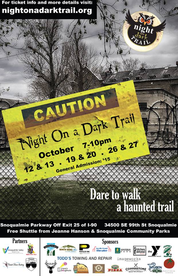 Snoqualmie’s own Night on a Dark Trail is back for its 8th season, turning trails on the east campus of the Snoqualmie Valley Hospital – located at 34500 SE 99th Street – into a haunted production!