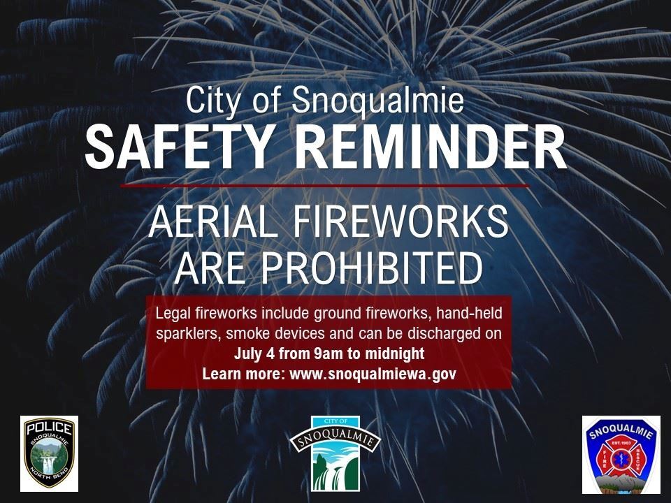 As we prepare for the Fourth of July holiday, the Snoqualmie Fire Department would like to remind you about fireworks regulations in the City of Snoqualmie and to use caution in our dry weather.
