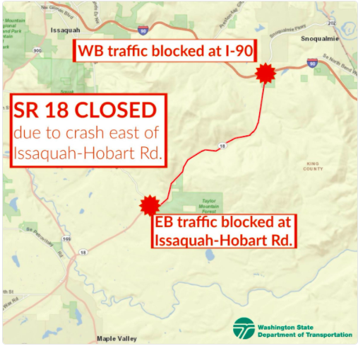 On Monday evening, February 5, 2018, the Washington State Department of Transportation (WSDOT) said a serious accident had both directions of SR 18 blocked just east of Issaquah-Hobart near milepost 20.