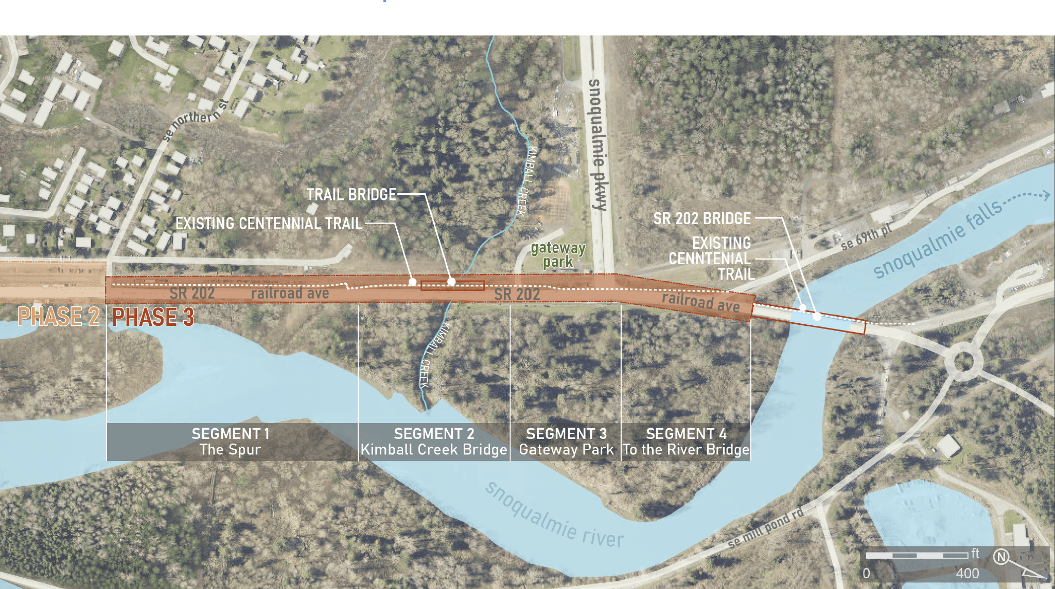 The City of Snoqualmie has been working with stakeholders to finalize the design direction of the Town Center Phase 3: Centennial Trail Improvements Project, which will redesign and enhance the trail between the Snoqualmie River bridge (near the Falls) and downtown Snoqualmie, creating a continuous shared path for pedestrians and bicyclists.