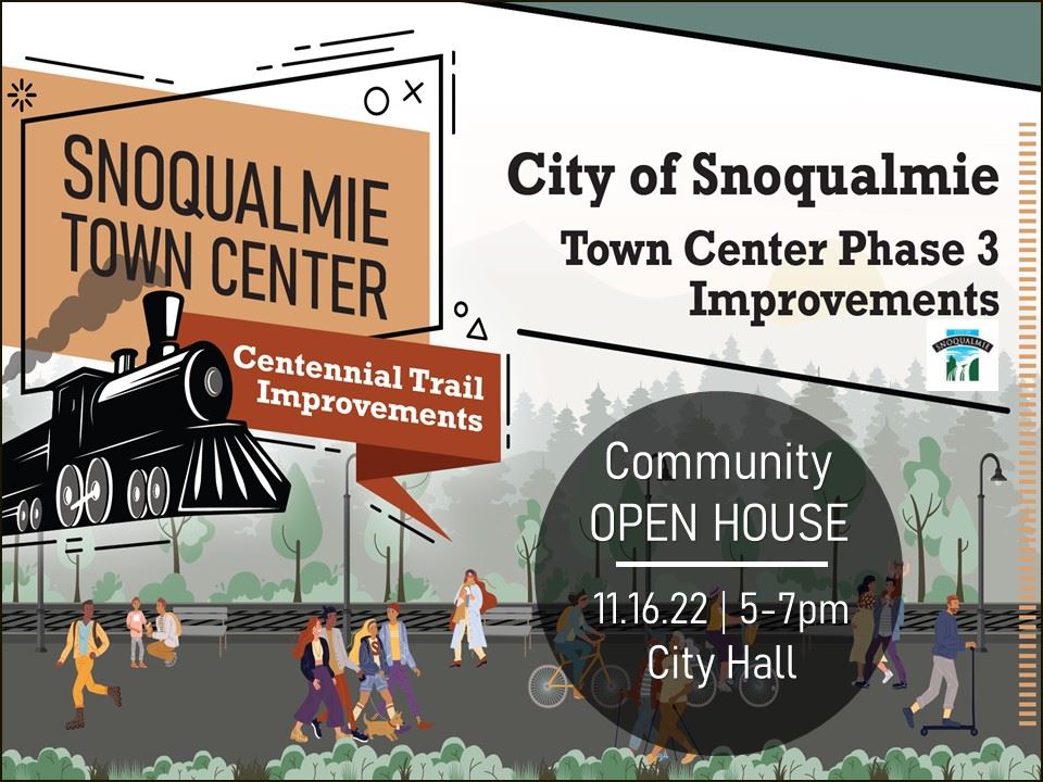 Join the city in Snoqualmie Council Chambers on Nov. 16, 2022, from 5-7 pm, to view the committee’s preferred design direction for Centennial Trail Improvements – and provide input on the design options moving forward.