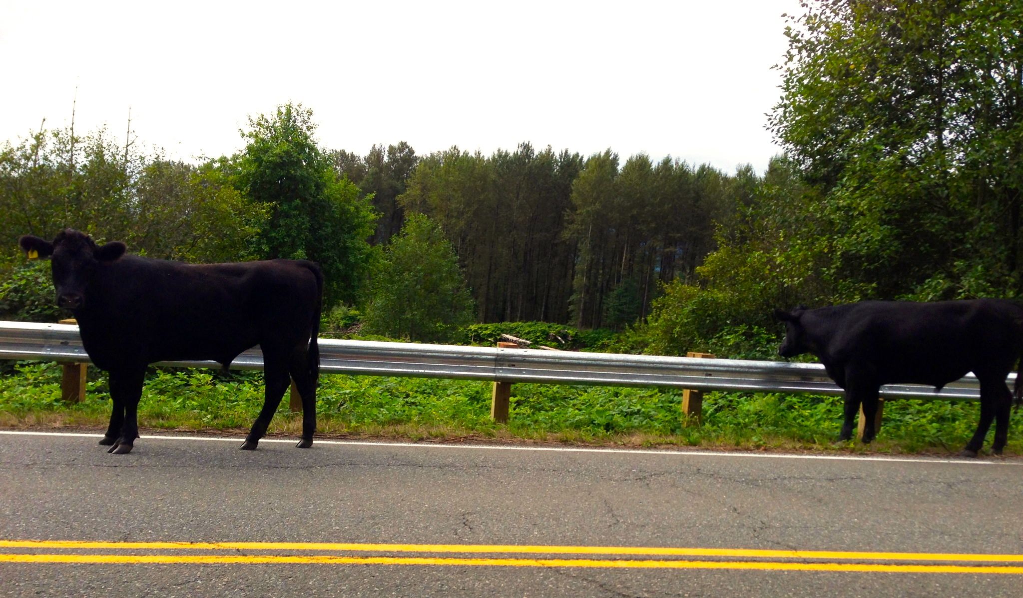 This is not the first time we’ve been notified about the elusive cows wandering the streets near the Snoqualmie River, as they have been the subject of previous local yahoo group postings, attempting to locate the owners of the animals. This is, however, the first time someone has captured and sent in photos of the two big black cows.