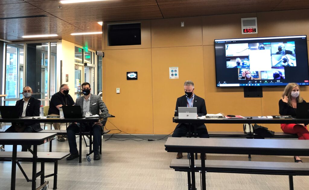 The meeting took place in person (for the first time since Spring 2020) and on Zoom from the Mount Si High School Freshman building Common’s area. Health and safety measures included limiting and pre-registering spectators, health attestations, social distancing and spaced seating. The tech included a Swivl device to capture the live presentations and discussions. One Director (Carolyn Simpson) attended remotely only via Zoom.