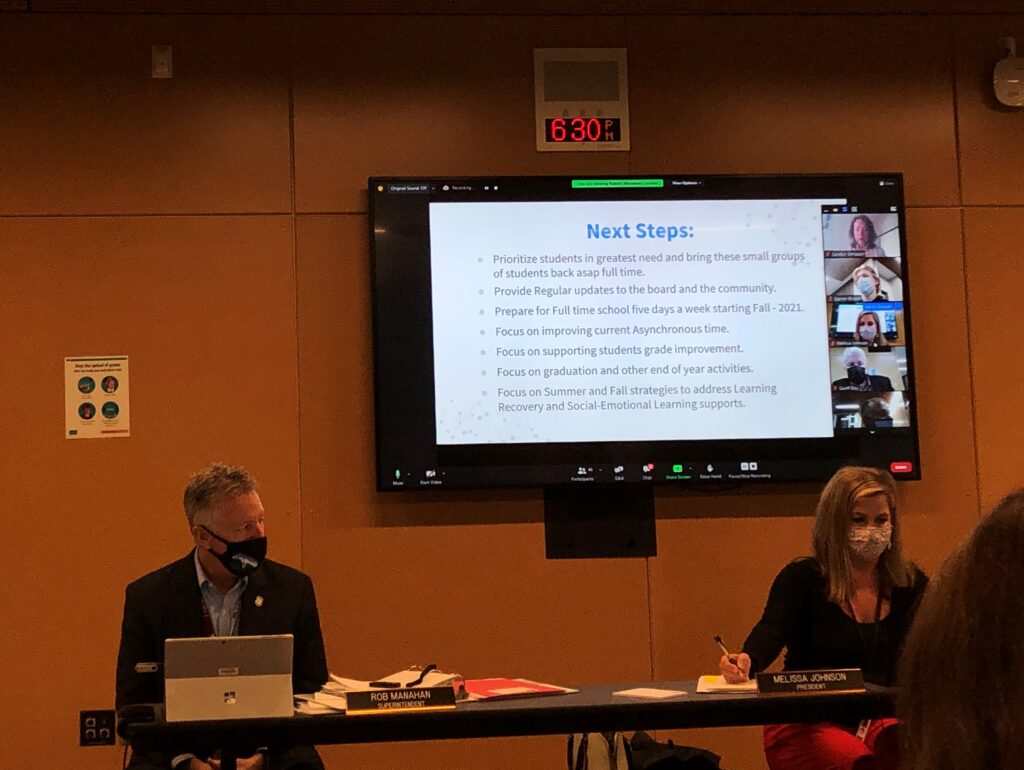 The next Steps included prioritizing students in greatest need to bring these small groups of students back asap full time (so far, elementary, middle and high school students have been identified and will be added as capacity allows). Provide regular updates to the board and the community. Prepare for Full-time school five days a week starting Fall – 2021. Focus on improving current Asynchronous time. Focus on supporting student’s grade improvement. Focus on graduation and other end-of-year activities. Focus on Summer and Fall strategies to address Learning Recovery, and Social-Emotional Learning supports.