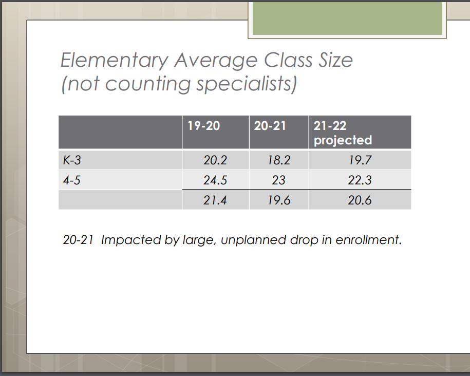 Class sizes 2021 in the Elementary level were unusually low due to enrollment, and this year they will be low to keep 3-foot distancing in classrooms. There are similar temporary reductions of class sizes in the middle schools and the high schools.