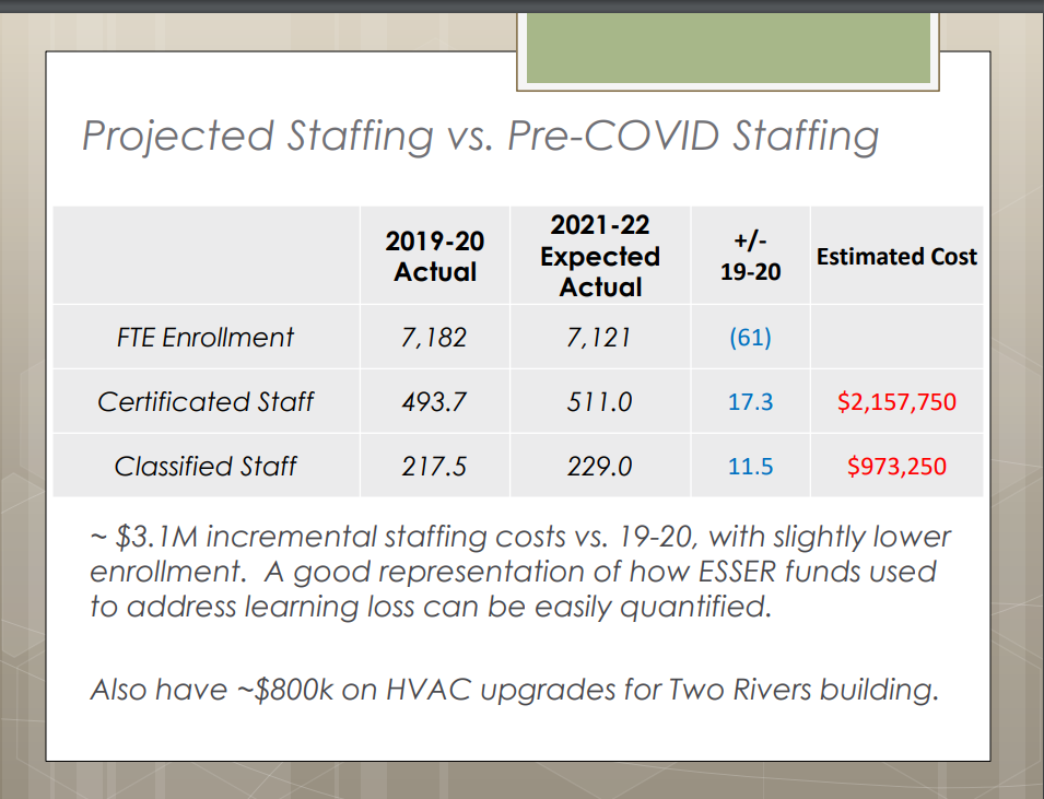 One Time negative revenue impacts expected due to: Food Service – Free meals for all students this year, ESSER Funds – Funding additional staffing to reduce class sizes, HVAC improvements at old Two Rivers building. Anticipated some ESSER funds will still be available for 2022-23, School Fees Elimination to get rid of all basic education school fees and backfill building budgets, as needed, with other funding sources. Band/Music fees; CTE supply fees; PE Shirt Fees totaling net -$80,000 due to fee reductions. No changes to extracurricular fees. Also eliminating MSHS parking fees to try to help alleviate transportation demand vis-à-vis our bus driver shortage.