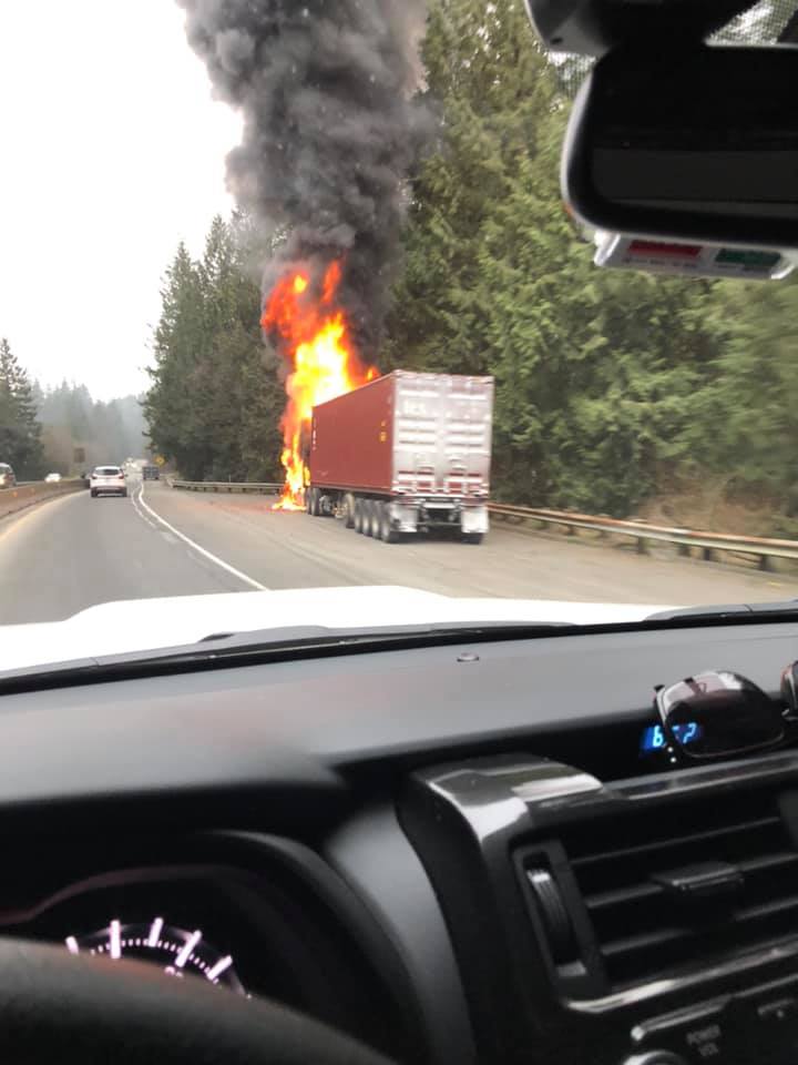As if 9:09 AM this morning, Highway 18 is completely blocked near the summit due to a semi fire. (MP 20)