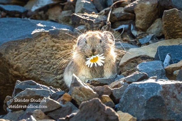 Pikas are adapted to living in a unique environment. You’re most likely to encounter a pika in high mountain areas with rocky talus slopes, often above the tree line. Talus is the piles of rocks that accumulate at the base of cliffs or slopes. Pikas utilize the small spaces between the rocks for protection and to den. They’re generalist herbivores, which means they eat a variety of plants, like grasses, ferns, wildflowers, and more depending on their availability. Learn more about pikas here.