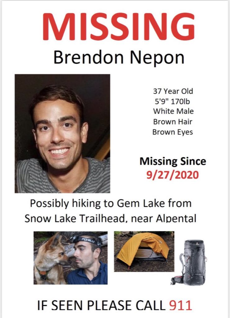 King County Sheriff and Search & Rescue are looking for Brendon Nepon and his dog after they were last seen on Sunday, 9/27/2020, near the Snow Lake Trailhead.